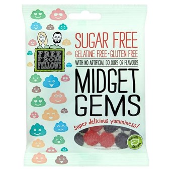 Free From Fellows Midget Gems are part of a much welcomed line up of the UK's favourite confectionery products but with a fabulous twist - they are made without sugar!! They are also gluten and gelatine free making them the latest stars in the Vegan and Vegetarian world of sweets. These are the only gummy sweets on the UK market free from sugar, gluten and gelatine and what's more they taste super delicious. Free From Fellows Midget Gems are gem shaped gummy sweets in Pomegranate & Raspberry and Blackcurrant flavours. All the smiles, with none of the nasties!