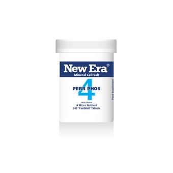 Iron Phosphate. New Era Mineral Cell Salts are homoeopathically prepared from safe, natural & non-habit forming ingredients. Recommended dose: 4 Fastmelt tablets 3 times a day